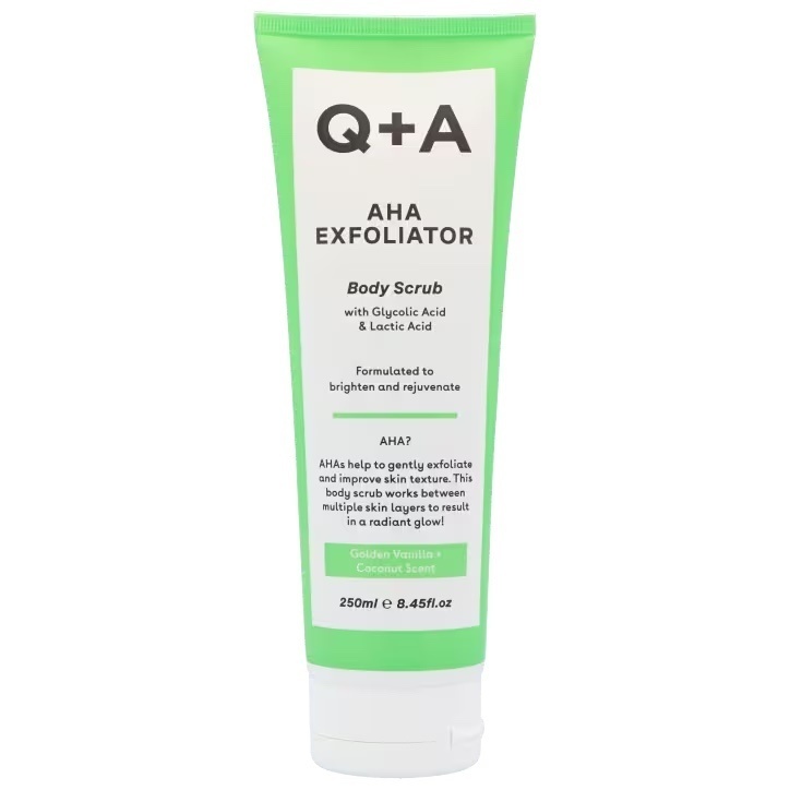 Deze body scrub van Q+A heeft AHA als hoofdbestanddeel. Enig idee wat AHA betekent? Met AHA bedoelen we alfahydroxyzuren, beter bekend als fruitzuren. De meest bekende zijn glycolzuur, melkzuur, appelzuur en citroenzuur. in deze body scrub vind je vooral glycolzuur en melkzuur, wat helpt om de huid zachtjes te exfoliëren en de huidtextuur te verbeteren. Deze lichaamsscrub werkt tussen meerdere huidlagen om te resulteren in een stralende gloed. Hoewel de naam anders doet vermoeden, is melkzuur vegan. Het ontstaat als gevolg van verschillende biologische processen zoals fermentatie door bacteriën. Dit product is dus helemaal vegan.